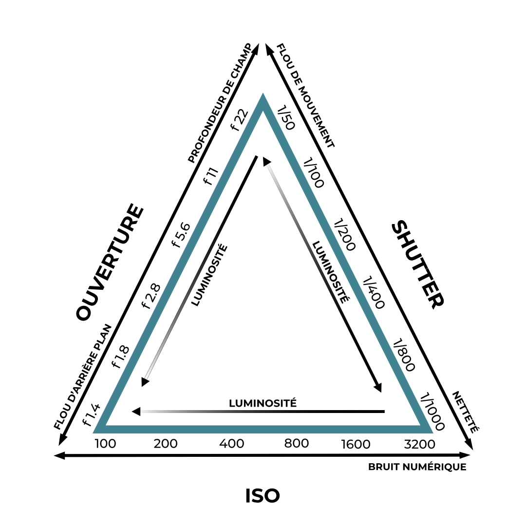 Le triangle d’exposition est un concept fondamental qui va vous guider pour dompter le mode manuel. Comme son nom l’indique, il s’agit de trois réglages principaux